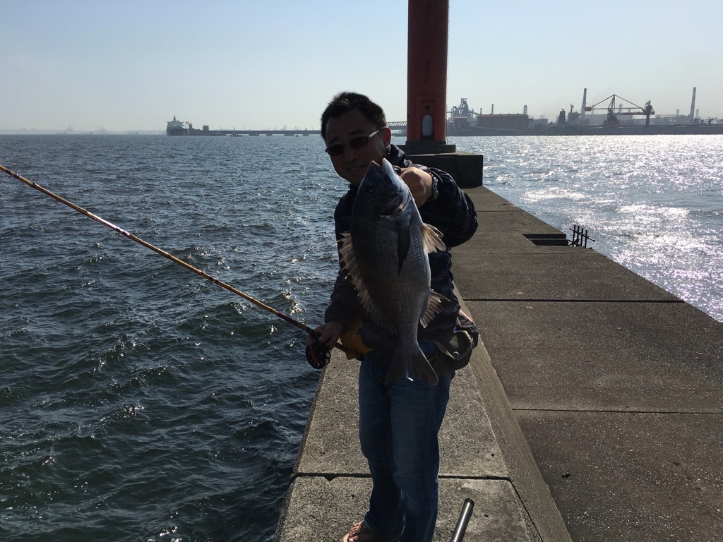白ケーソンの辺りでコバの方を見ると、M名人が良型をゲットしておりました。